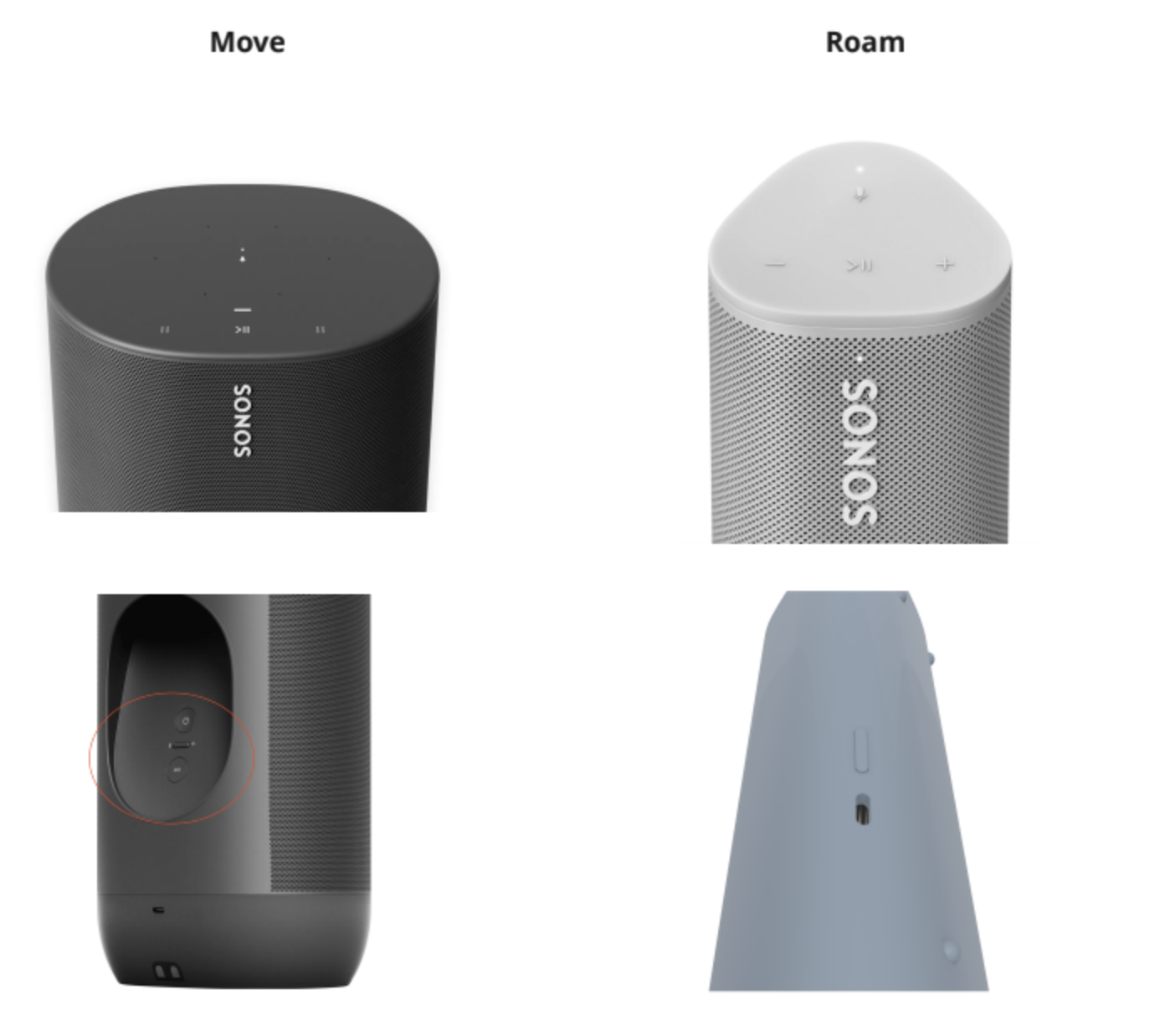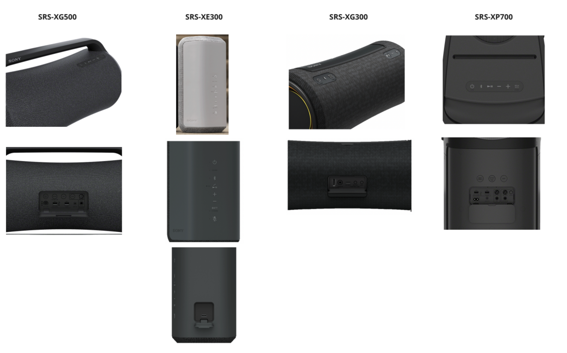 Take aways: consistent with their icons and protruded / textured UI, consistent with where UI is located on each speaker (top and side), ports on back are protected by a door, power button is the same on all, LEDs for power and Bluetooth are the same