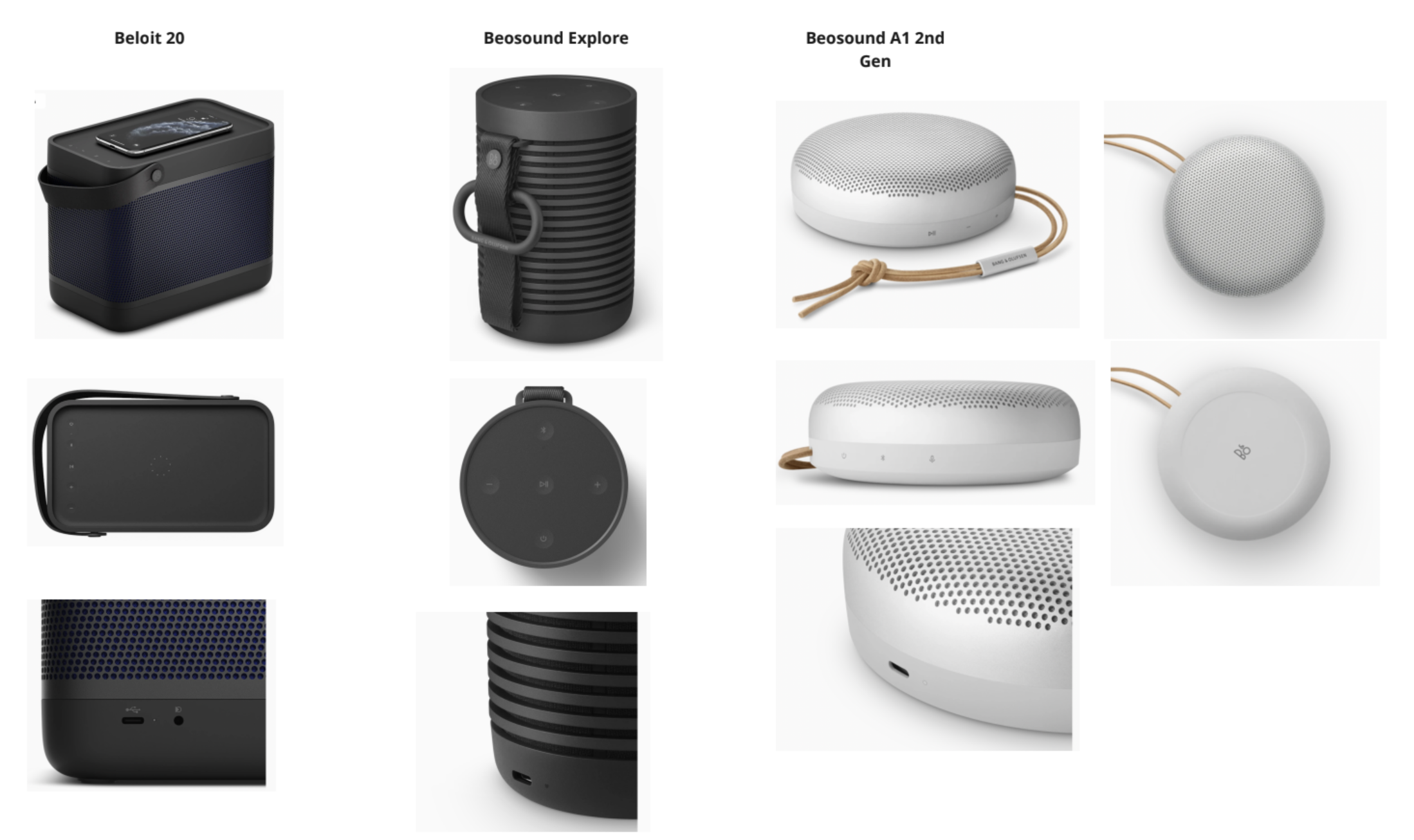 Take aways: sophisticated look, similar features as JBL but less “flashy”, on product UI different across all speakers - both what features and where they are located.