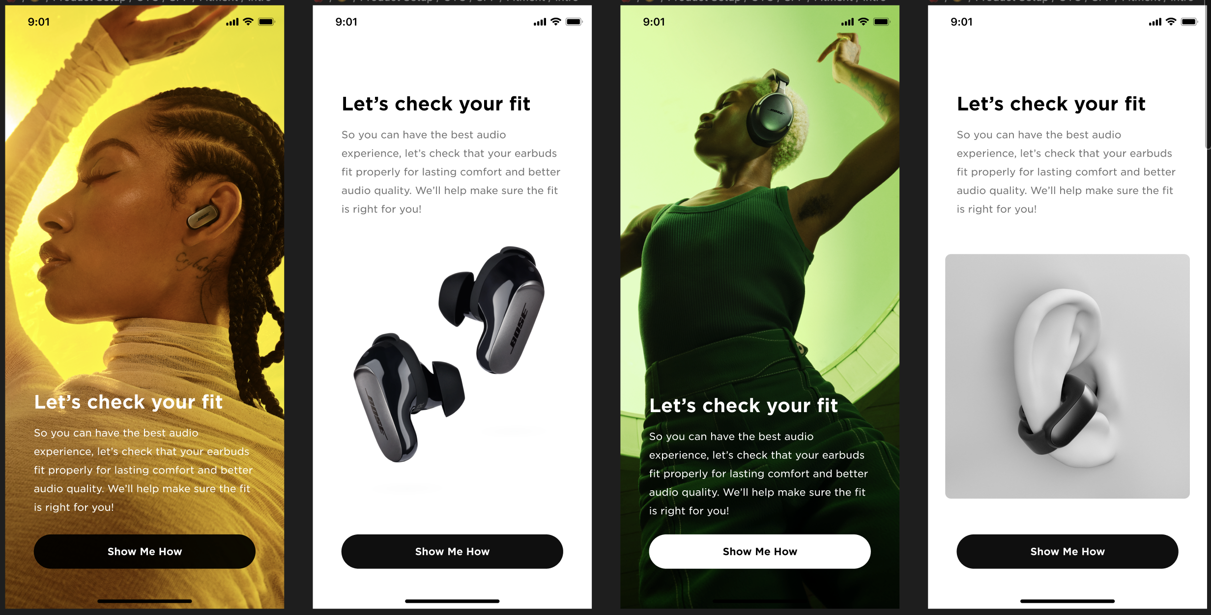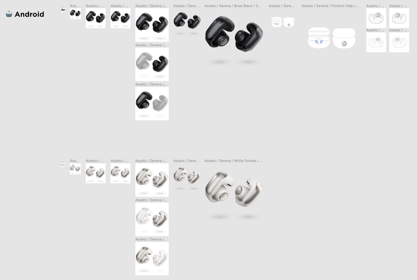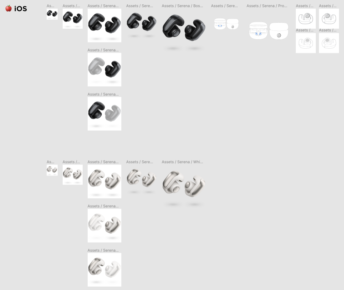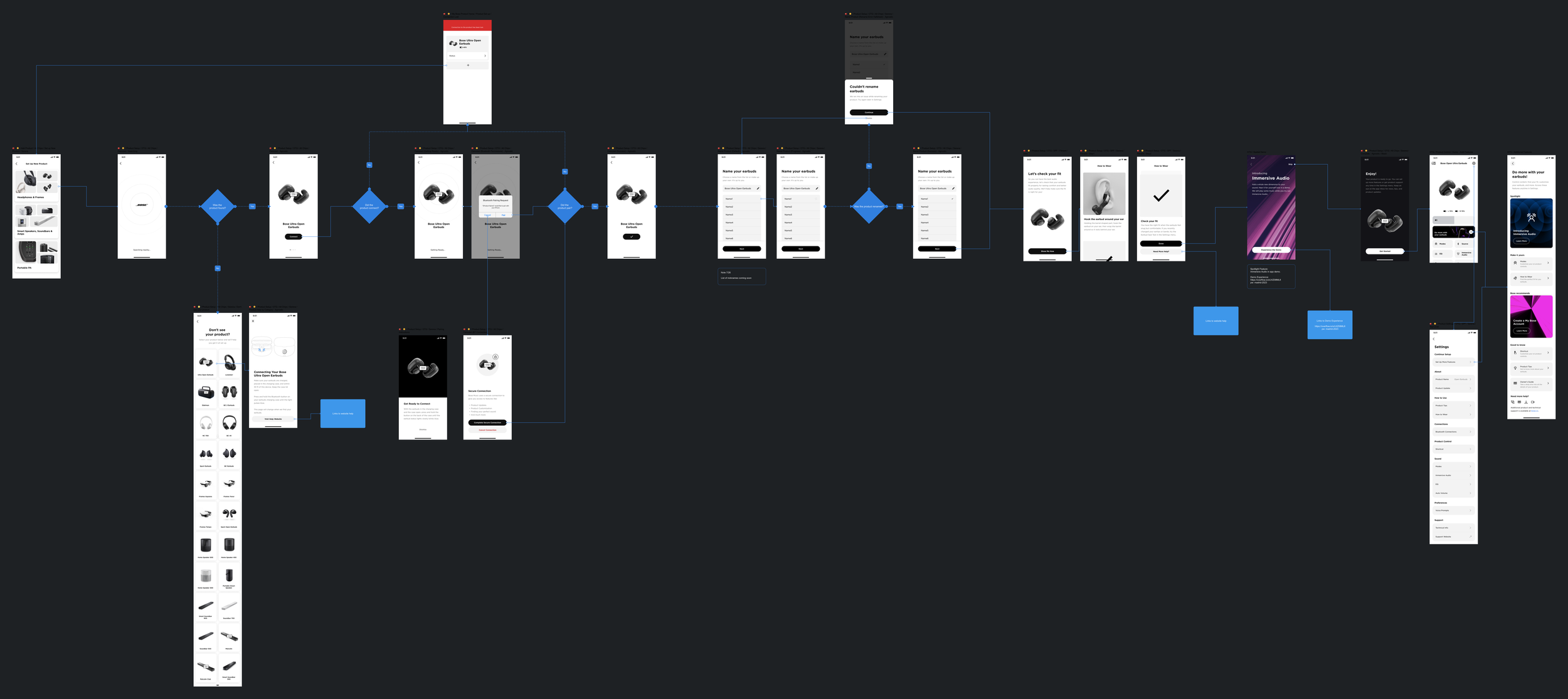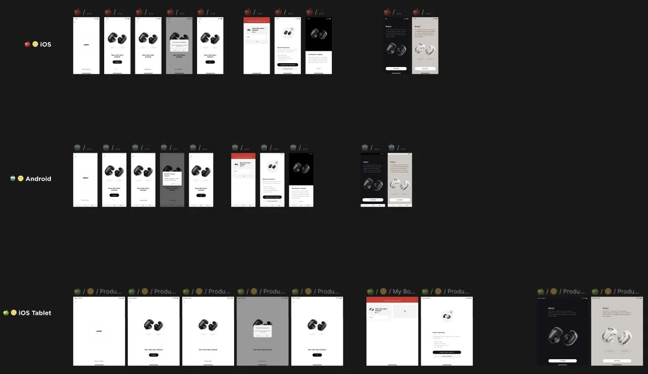 Working within Bose’s structured design system, I pulled all relevant screens for on-the-go product set ups and update product information (names, images, features, functions). Broken up and organized in Figma, we use files with different pages for each product dependent on the category: on-the-go or in-the-home. Within each page, we organize by device type the Bose app supports.